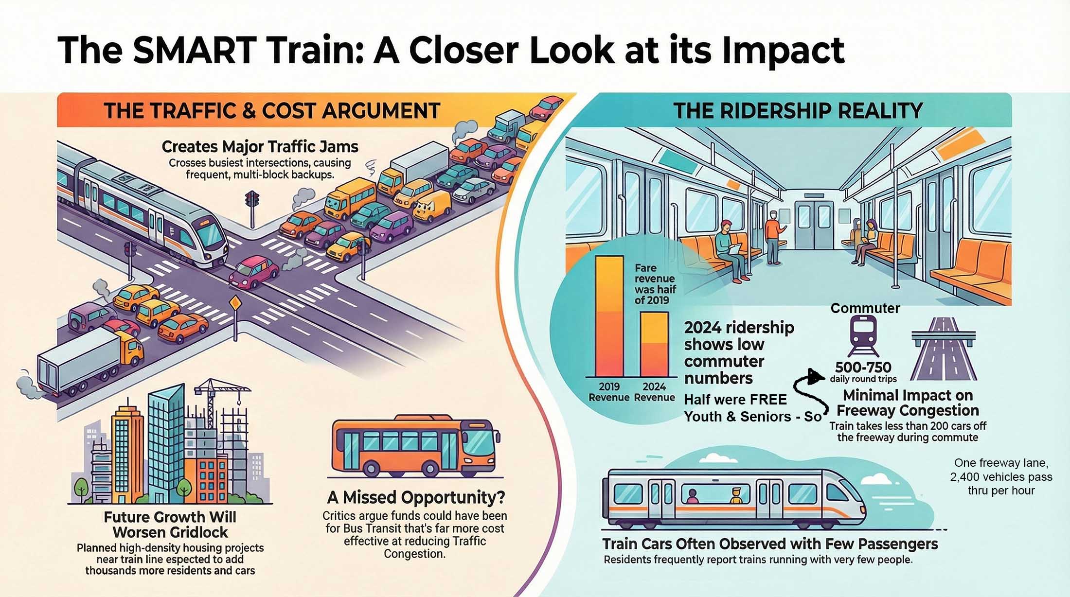 Clipper and APP data tells us that WeekDay Roundtrips are only 1,026 . APTA says only 42% of Train Rides come from Displaced Single Occupant Vehicles so its 1,026 x 2/3 x 42% = 287 ex-car riders now commuting by train. The average train journey is 20 miles ( out of the 45.4 miles from Santa Rosa Airport to San Rafael) then the average effect of SMART at any point on HWY101 is 287 x 20/45.4 = 126 So SMART takes only 126 cars off HWY101 ( at all points between Santa Rosa Airport and San Rafael) during the weekday commute. One freeway lane transmits 2,400 cars in one peak