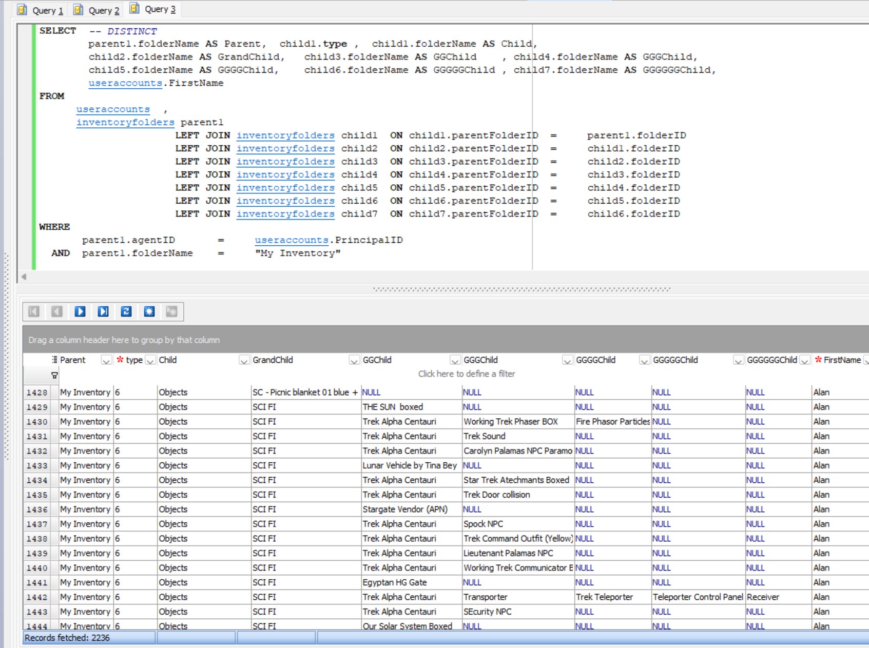LEFT JOIN inventoryfolders child3 ON child3.parentFolderID = child2.folderID